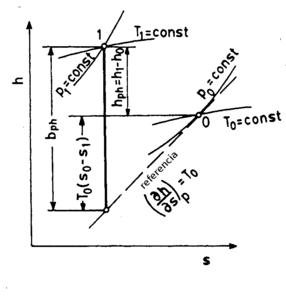 . El punto 1 representa el estado inicial de la sustancia, y el punto 0 representa el estado termodinámico del entorno. La pendiente de la tangente a cada una de las curvas isobáricas es proporcional a la temperatura absoluta. Por tanto, la longitud del segmento vertical que va desde el punto 1 hasta la tangente a la isobárica que pasa por el punto 0, representa el valor de la exergía física específica.
