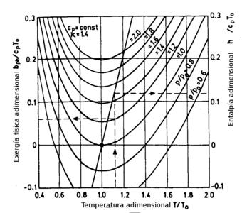 La exergía física específica (esto es, por unidad de masa) se muestra en la figura